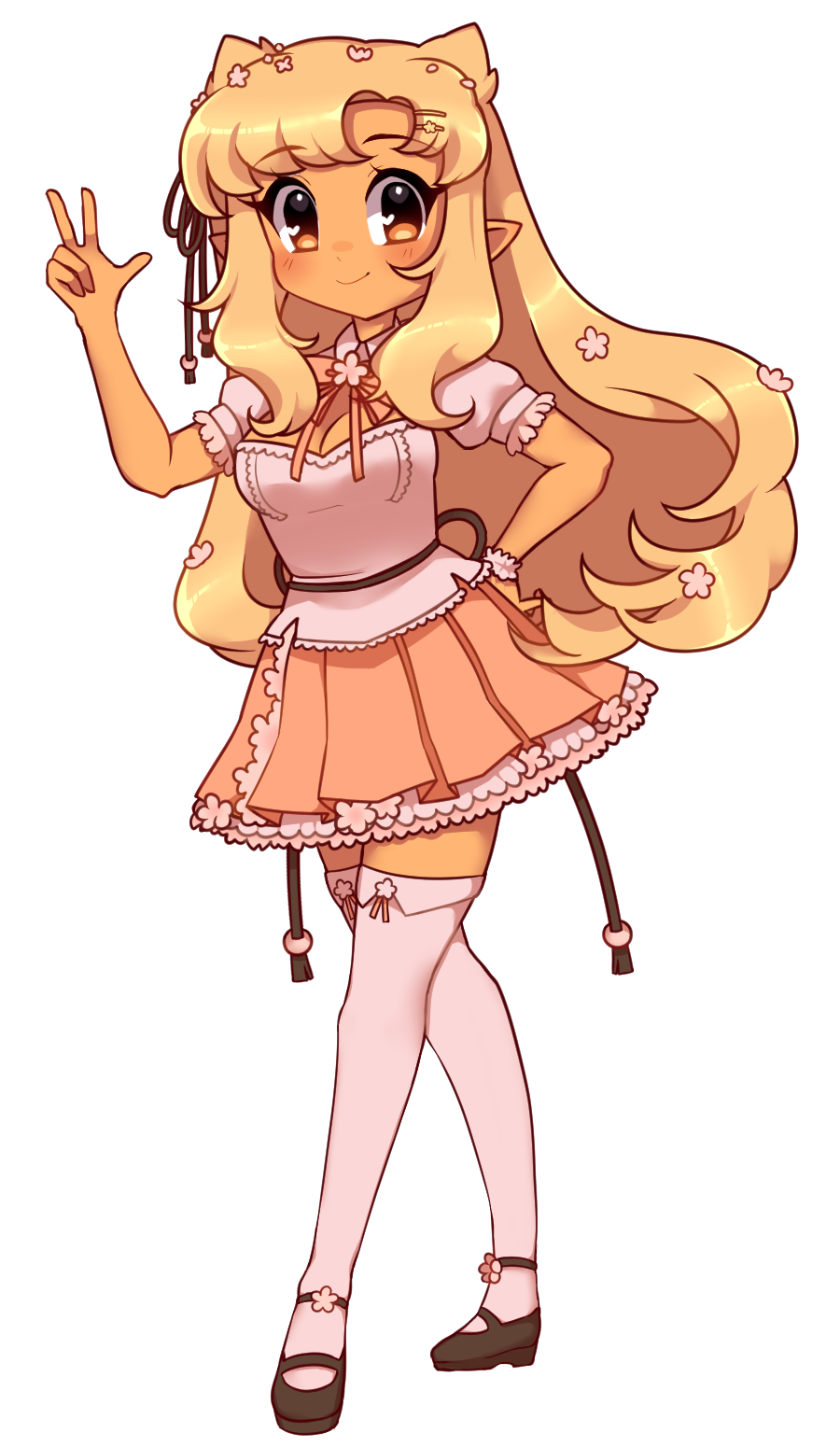 she's my online mascot, rocku! she's a half demon, half nymph who hides her demon horns under her hair. She represents a cutesy aesthetic with a hidden cheeky side. her design embodies everything i love from cherry blossom and kawaii fashion, to warm colour palettes.